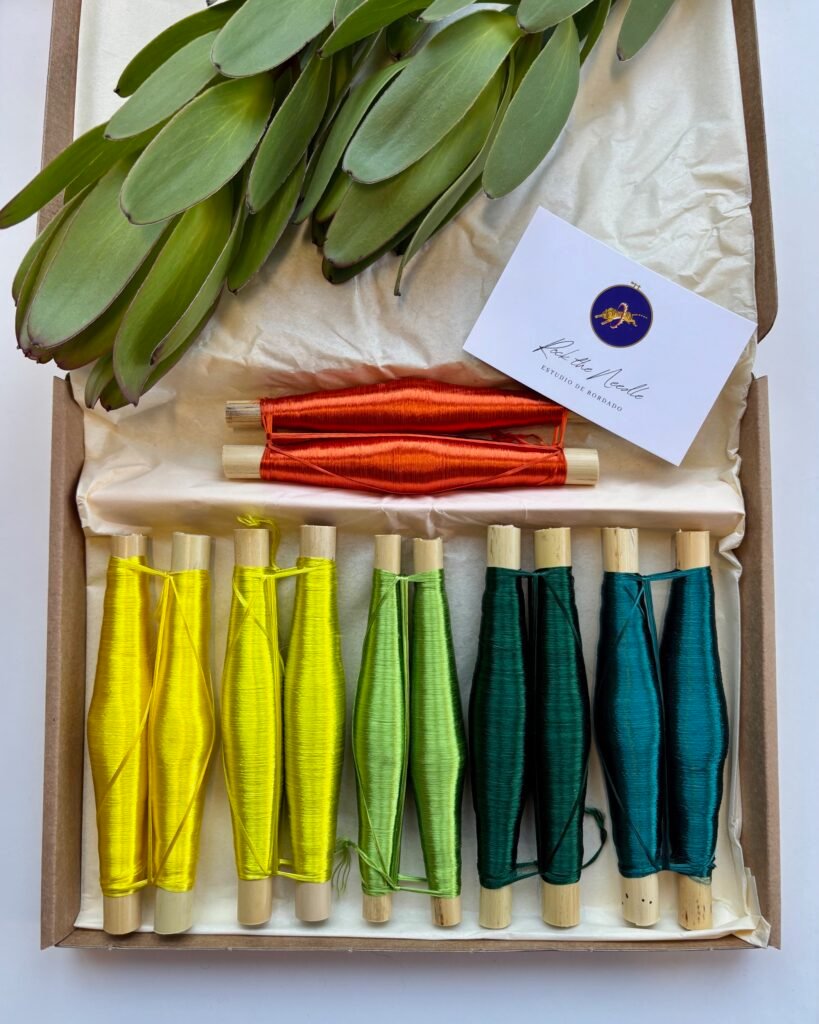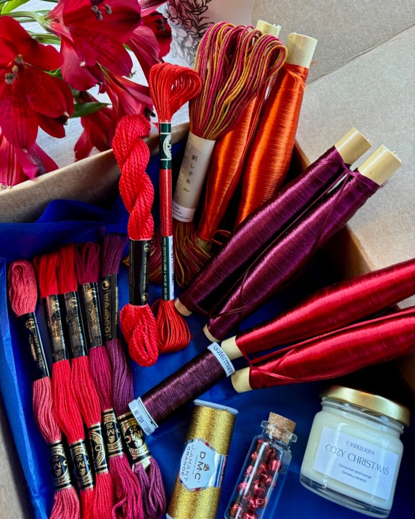 Incluye: 1 madeja satín floss DMC, 1 madeja algodón perlé DMC (15m), 5 madejas mouliné DMC, 3 bobinas dobles de hilo de sabra sintético montadas sobre bambú, 1 madeja de hilo de sashiko Olympus (20m), 1 bobina de hilo metalizado Gütermann (200m), 1 bobina diamante gradé DMC ( 20m), bote de cristal con campanillas decorativas, vela artesanal de Candela Rosa.