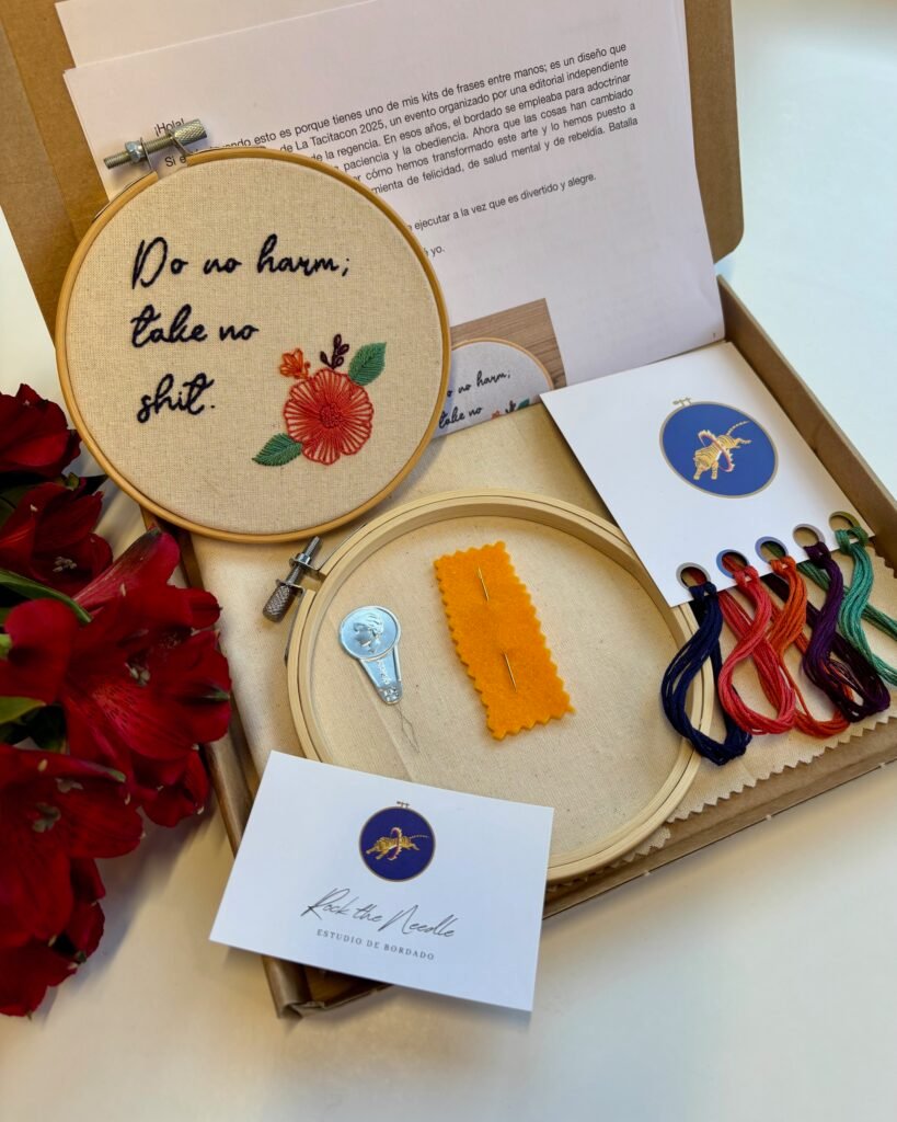 Descripción: Disponible en dos modelos: «Do no harm, take no shit» y «Fuck the patriarchy», con este kit de iniciación al bordado podrás empezar a bordar letras para expresar todo lo que tienes que decir.