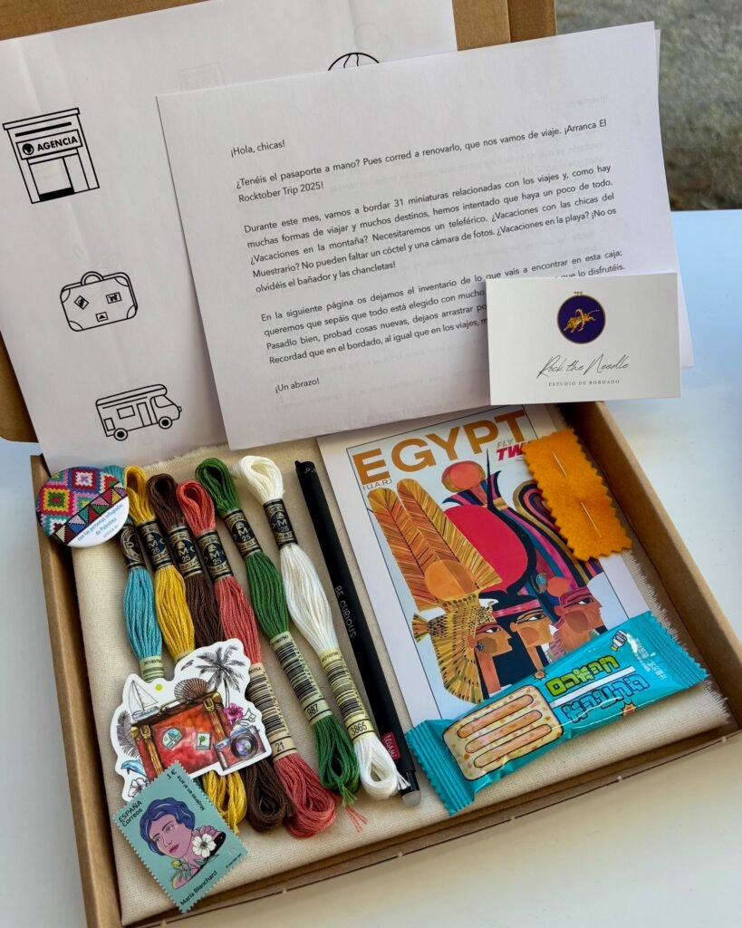 Descripción: Esta caja tan especial corresponde al evento comunitario más querido en nuestra comunidad: el Rocktober, como denominamos al mes en que cada día una de nosotras borda una miniatura de una temática específica.